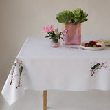 This tablecloth is a delightful fusion of elegance and whimsy, offering a charming touch to any dining setting. Crafted from fine, high-quality fabric, it boasts a soft and smooth texture that drapes gracefully over the table's surface. The pristine white canvas serves as the perfect backdrop for a stunning array of meticulously embroidered birds.