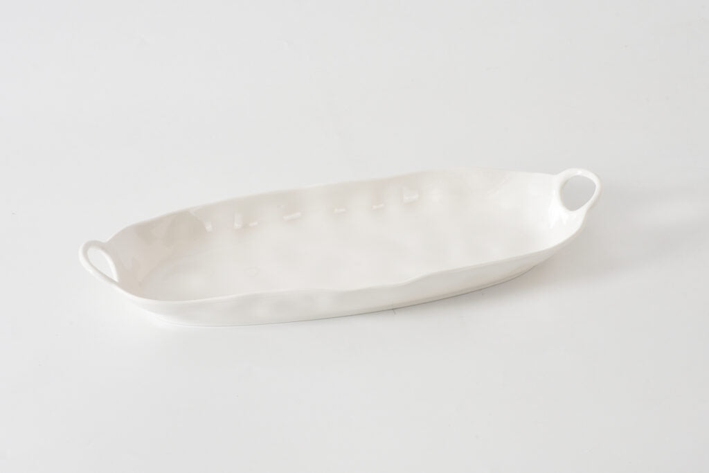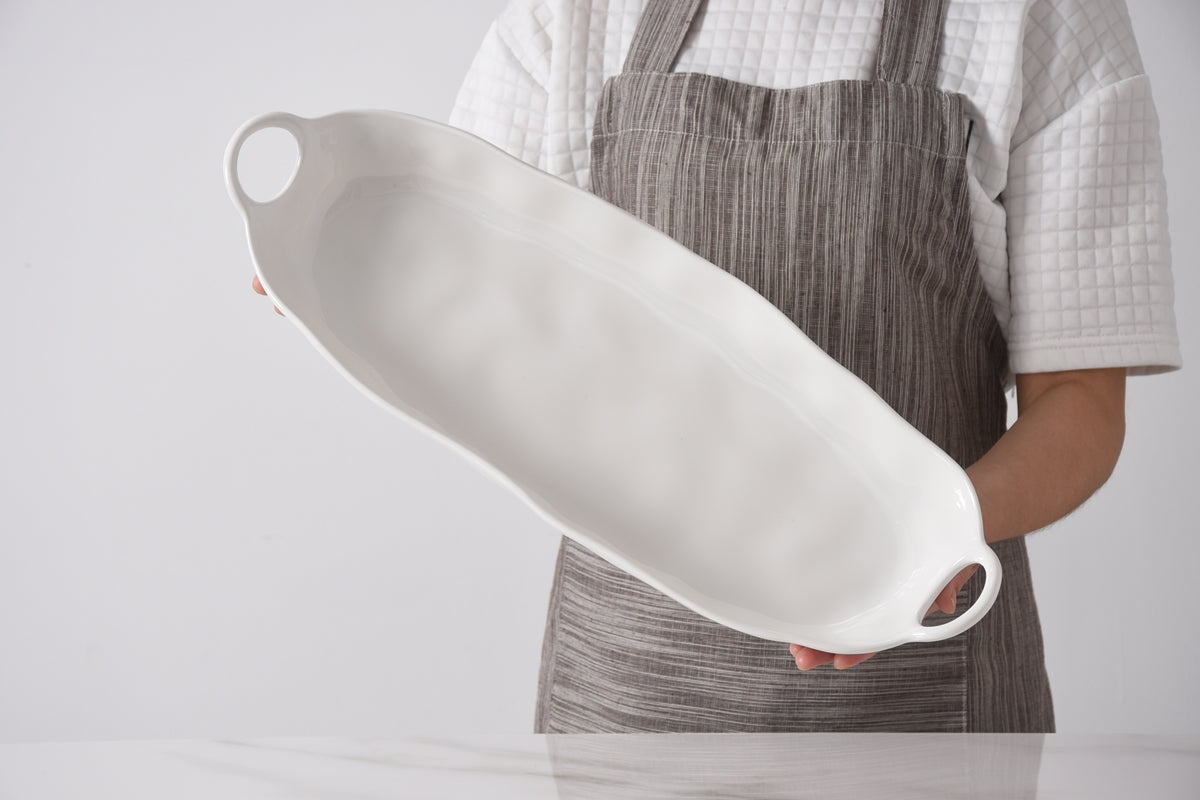 Deep Long Server from our Ivy Collection. This platter is great for serving an assortment of freshly sliced breads or a variety of appetizers from stuffed mushrooms to baby lamb chops to yakitori. Asparagus, carrots, green beans, even a whole fish all are stunning on this piece. Sleek white-toned superior quality melamine. Great for your indoor and outdoor activities. Food safe, freezer safe, dishwasher safe. Easy Care.