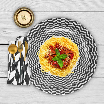 Bring bold elegance to your dining experience with the Black and White Chevron dinner plate.