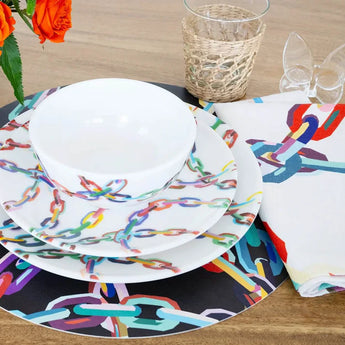 This 9” plate, featuring bold chain link patterns, is ideal for salads, appetizers, or smaller meals. It brings geometric sophistication to your table.