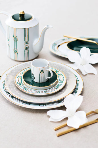 One of our most distinctive designs. With its weaving Arabesque pattern, Liberty presents an ornamental art nouveau style paired with an equestrian aesthetic. Gold trim only serves as a frame for the bewitching emerald green patternwork.