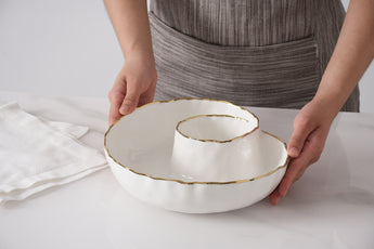 Round Chip and Dip in our Portofino Collection. Perfect for any dip combo : hummus and pita, salsa and tortilla chips, veggies and ranch or our favorite berries and whipped cream! Gorgeous white porcelain with a delicate gold trim. Food safe, tarnish free, dishwasher safe, oven safe to 500°. Easy Care.