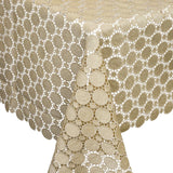 This tablecloth has a lace-like appearance with a repeating design of interconnected circles. The circles are either the solid beige or white, while the connecting threads are more translucent, creating a delicate and decorative look. The tablecloth has a somewhat vintage or classical style, making it suitable for formal or elegant settings.