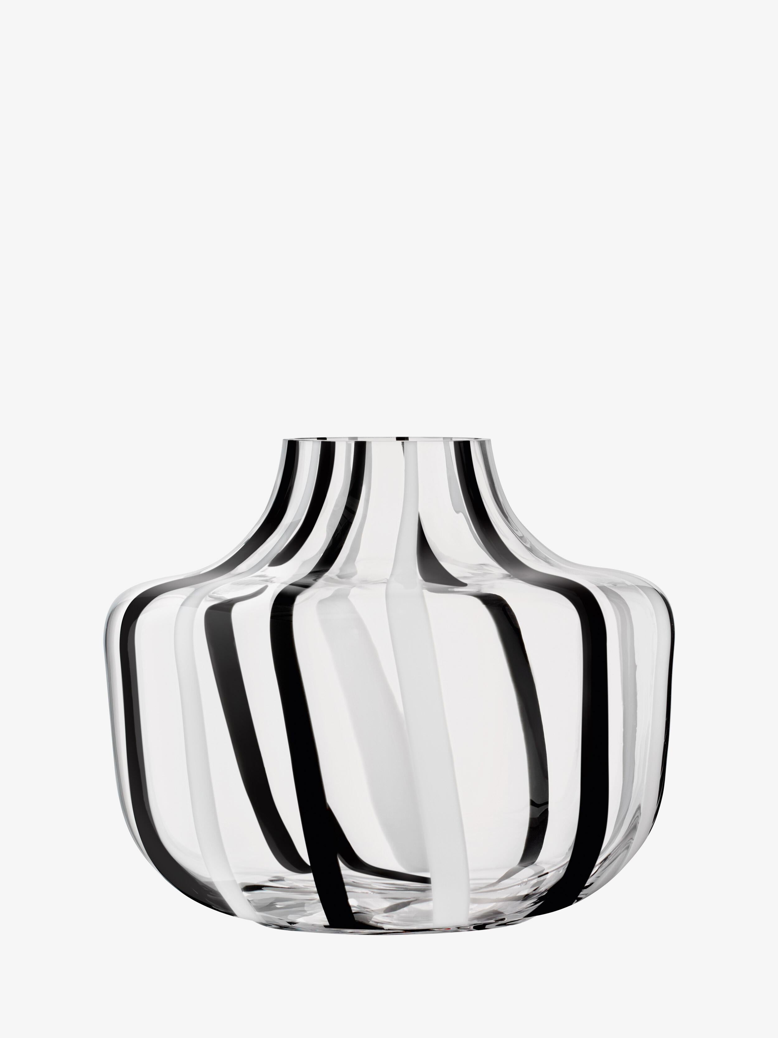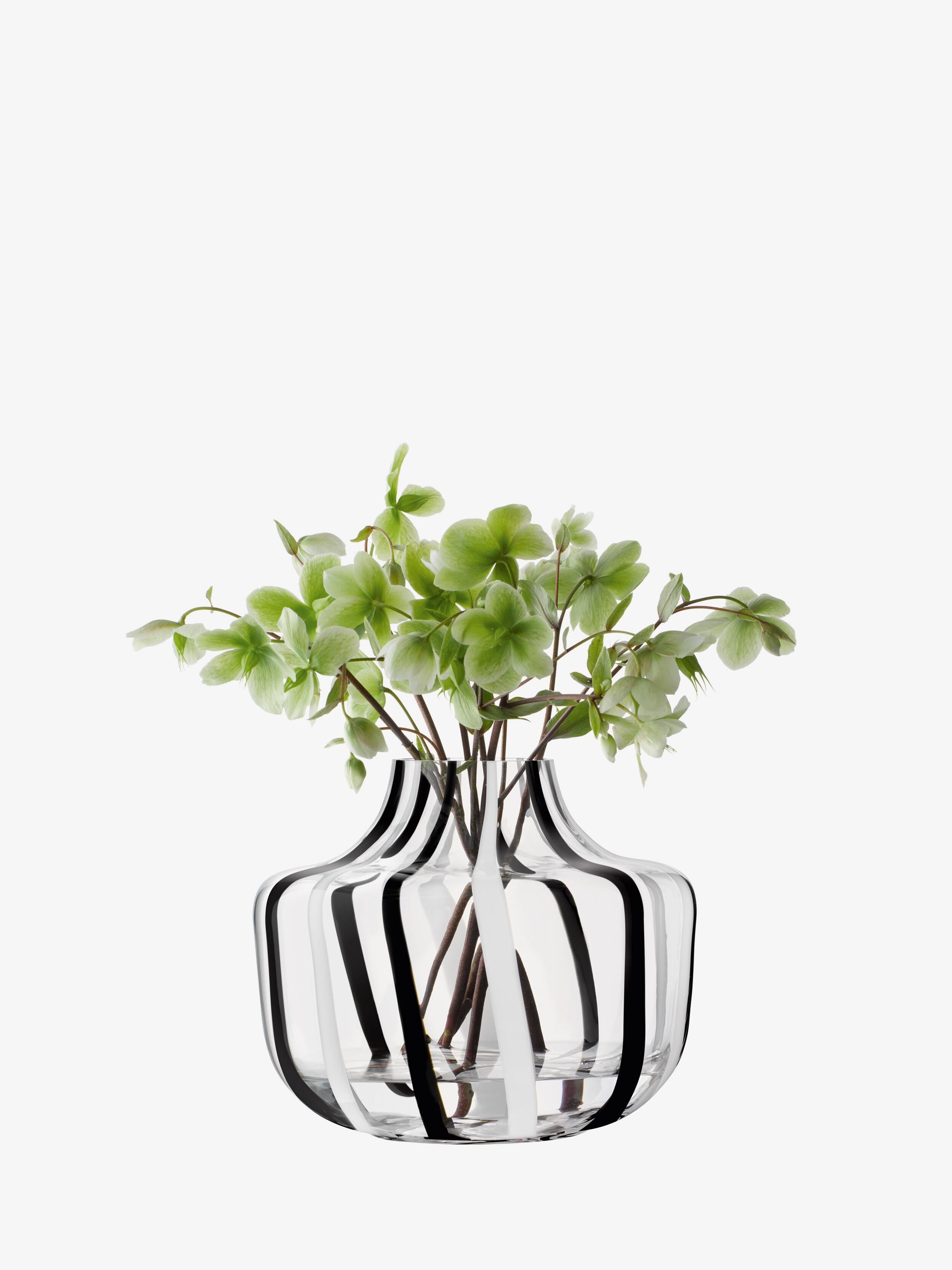 A modern mouth blown vase in a bulb-shaped silhouette and monochrome stripes that reference the mathematical works of Op Artists Bridget Riley and Victor Vasarely. Designed to bring a sense of movement and play to interiors, for displaying flowers or standing alone.