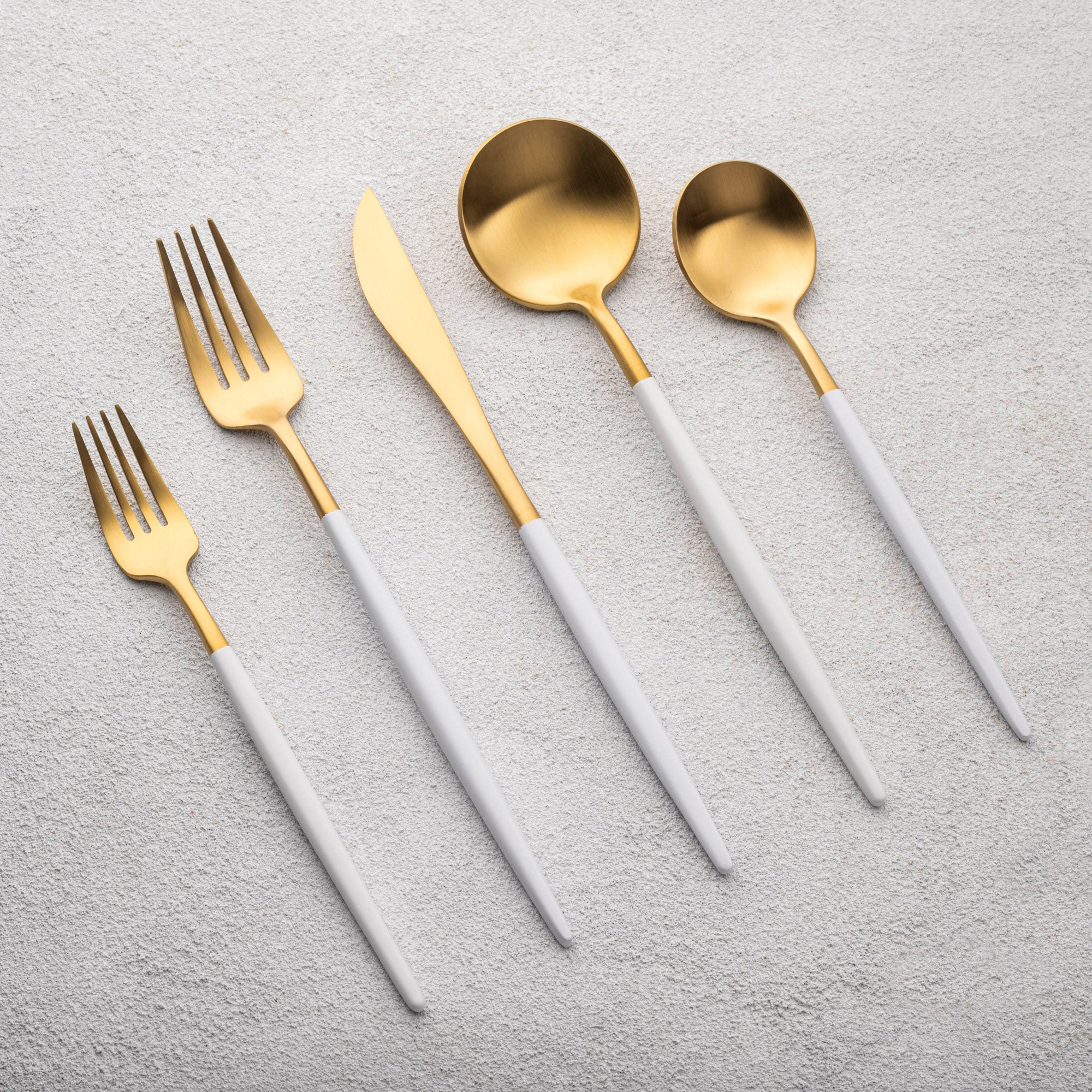 Vikko - Dine, Vera, Brushed Gold with White Handle, 18/10 SS, 20 Pc Flatware Set - Gift Box No Window