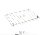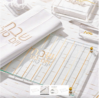 This magnificent, one-of-a-kind Vertical Lines Lucite Challah Board features a layer of lucite covered with tempered, heat and scratch resistant glass. Features thick clear lucite and a die cut vertical lines and words, and metal standoffs, lifting the board slighting off the table. Both practical and beautiful, this tray would make a great gift!