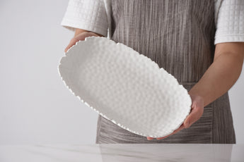 Small Serving Platter in Waves. The hammered texture and organic edges of this beautiful platter enable it to blend with a variety of table setting motifs. Perfect for appetizers, sliced baguettes or desserts. Great for your indoor and outdoor activities. Food safe, freezer safe, dishwasher safe. Easy Care.